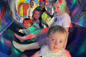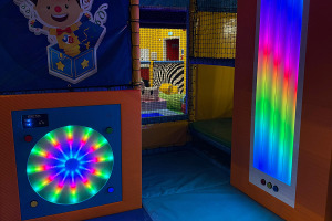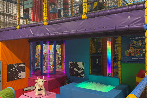 Children exploring a colourful soft play area at Jack in the Box Club, climbing, sliding, and enjoying interactive play structures.